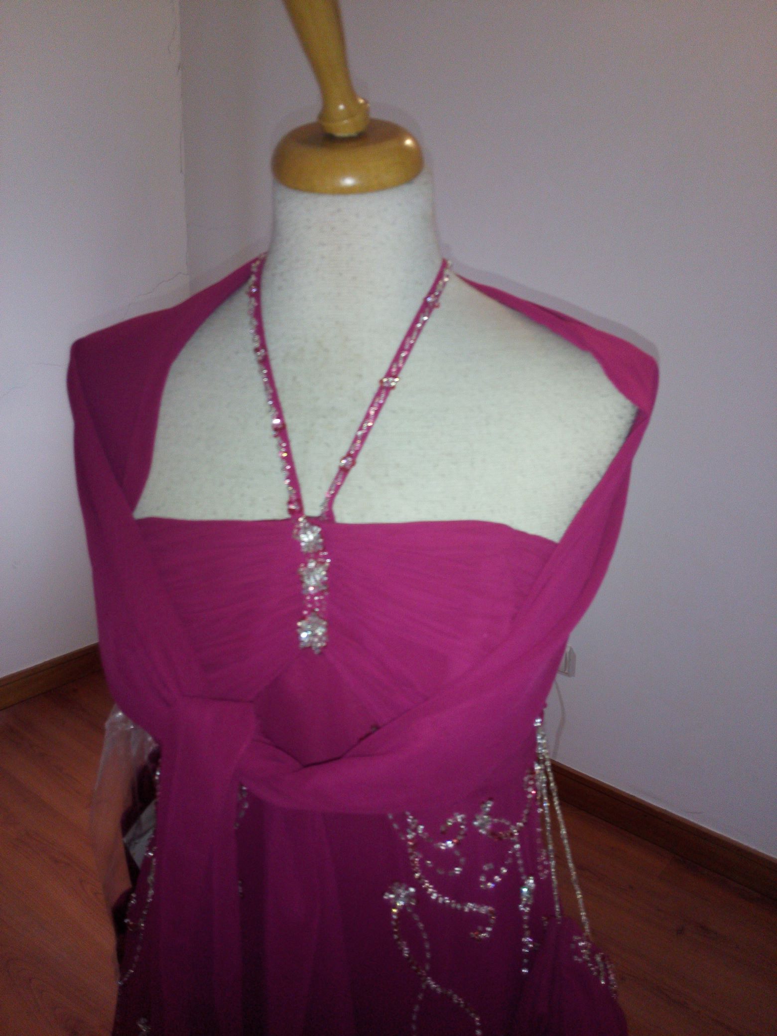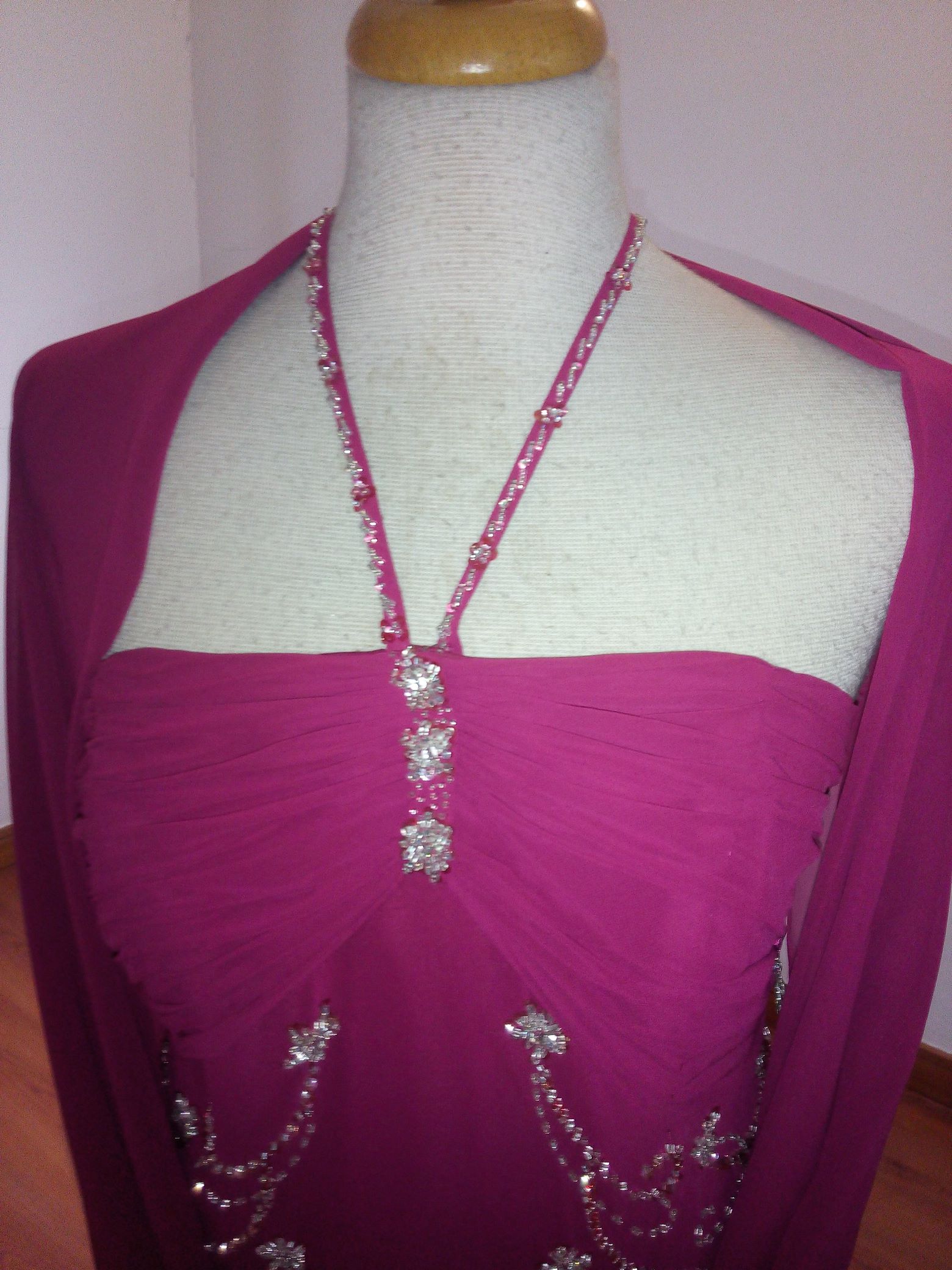 O corpete é estruturado e ajustado, com um detalhe drapeado na parte superior e uma alça ao pescoço adornada com brilhantes, conferindo um toque de glamour. O vestido inclui ainda um leve xaile do mesmo tecido, que é amarrado na frente, proporcionando um efeito fluido e delicado.