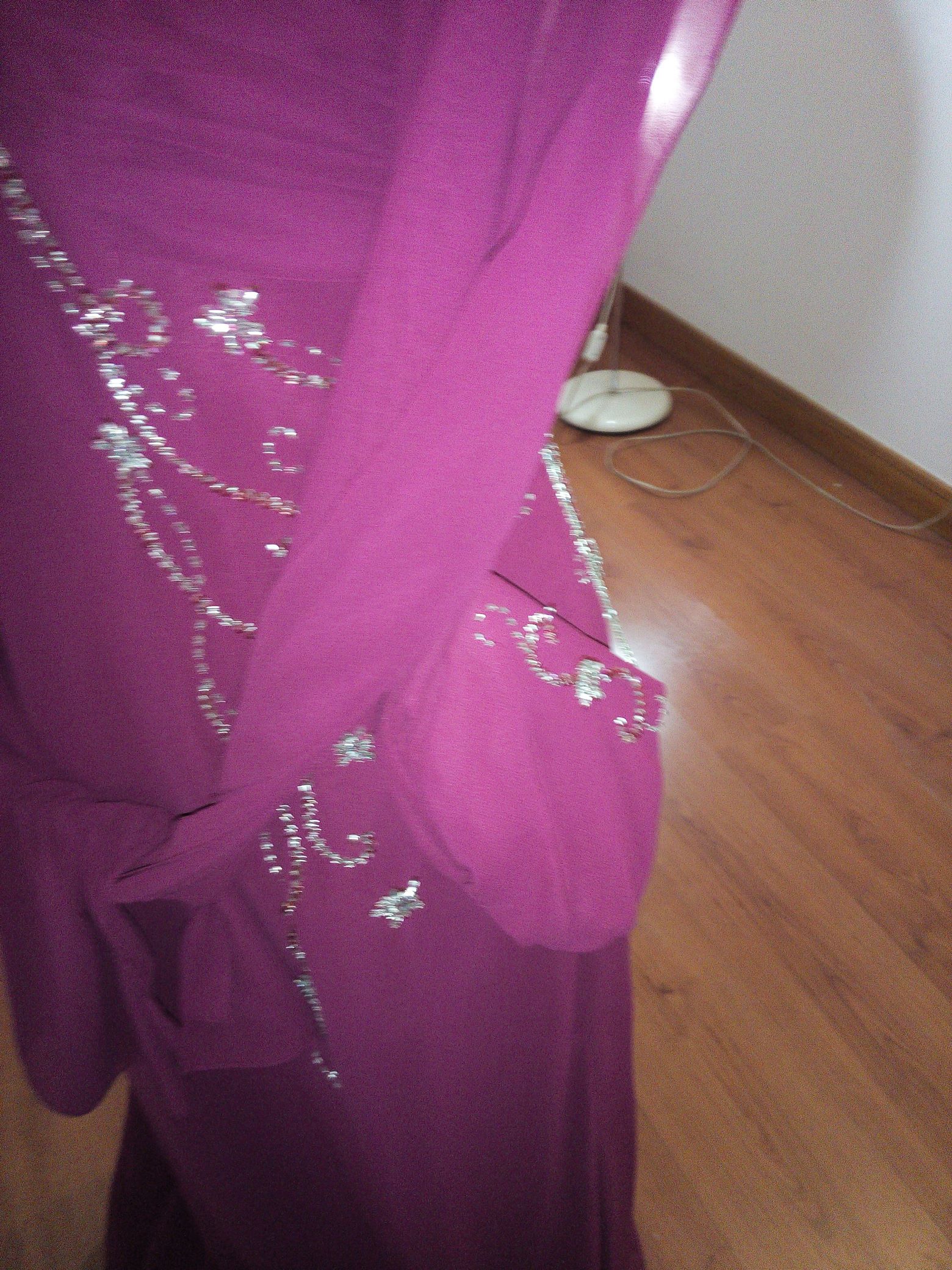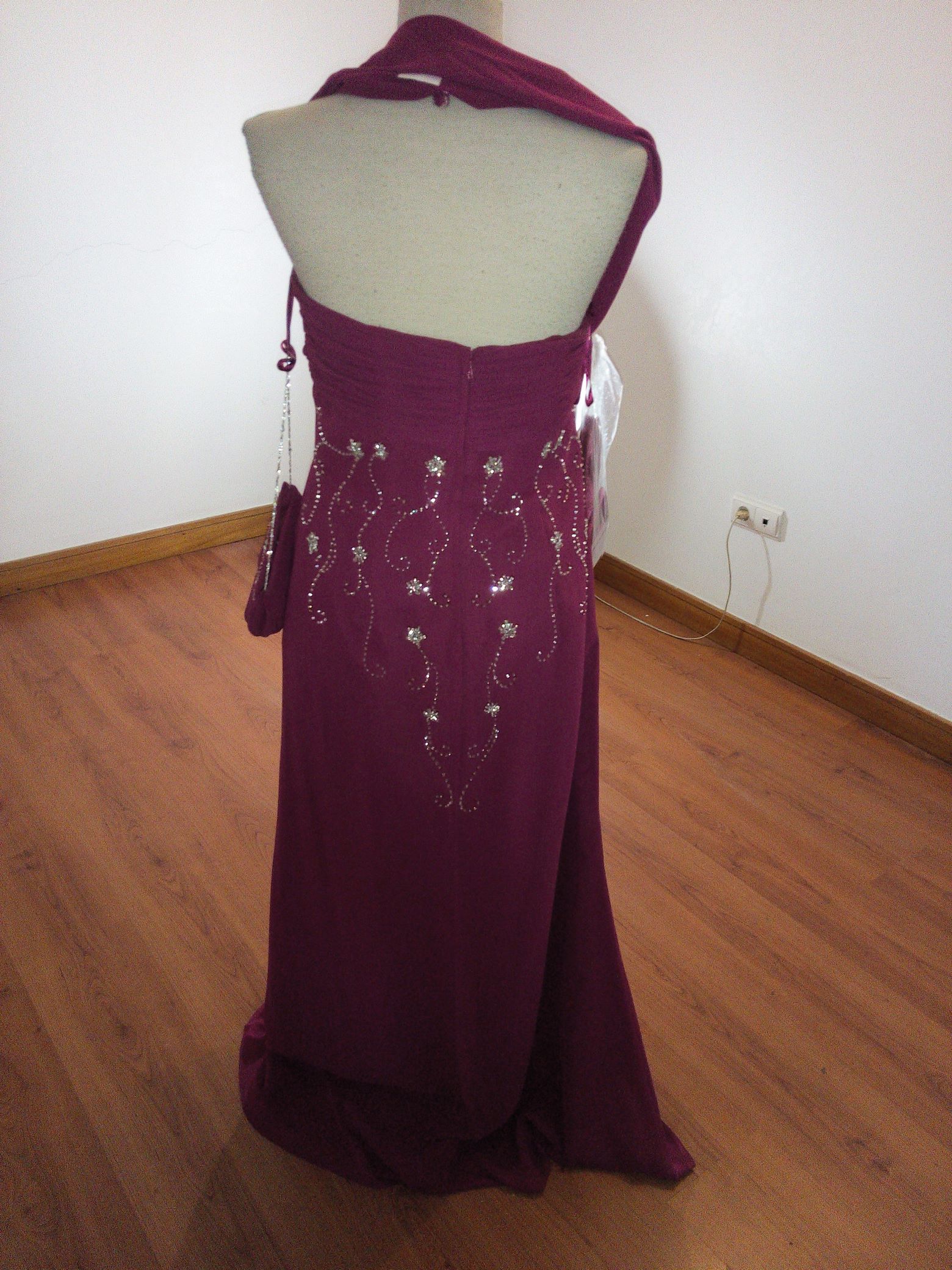 Este é um elegante vestido de cerimónia longo em tom de vinho, com um design sofisticado e detalhes requintados.